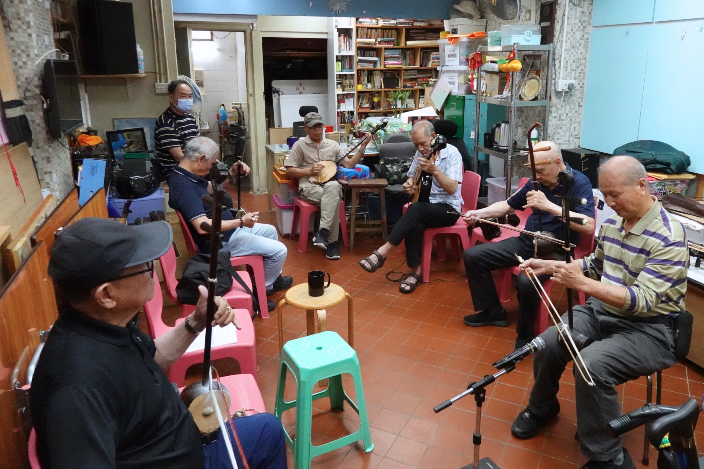 平日星期一至五的下午,師傅們便會聚在橫頭磡邨宏孝樓地下進行樂團排練;到周末,則在石硤尾耀東街的五金行,與其他中樂愛好者互相切磋,和街坊分享音樂。有別於一般中樂團,他們排練時沒有指揮,卻有一個「C位」——是給負責主旋律的樂手坐的。坐上「C位」的師傅可以點選接下來要演奏的歌曲,每當講出曲名後,便會由揚琴手負責起節奏,帶領樂隊整齊地演奏出來。多才多藝的師傅們,時不時更會交換樂器演奏;更令人敬佩的是,全場沒有一個師傅需要看樂譜,便夠輕鬆背奏30至40多首廣東民樂。師傅們笑道:「我們就是人肉電腦,不需要樂譜,都已經倒背如流」。